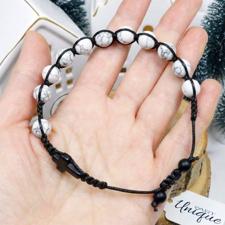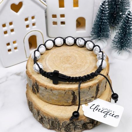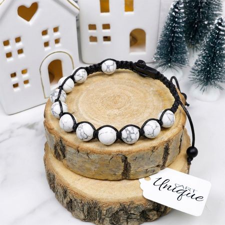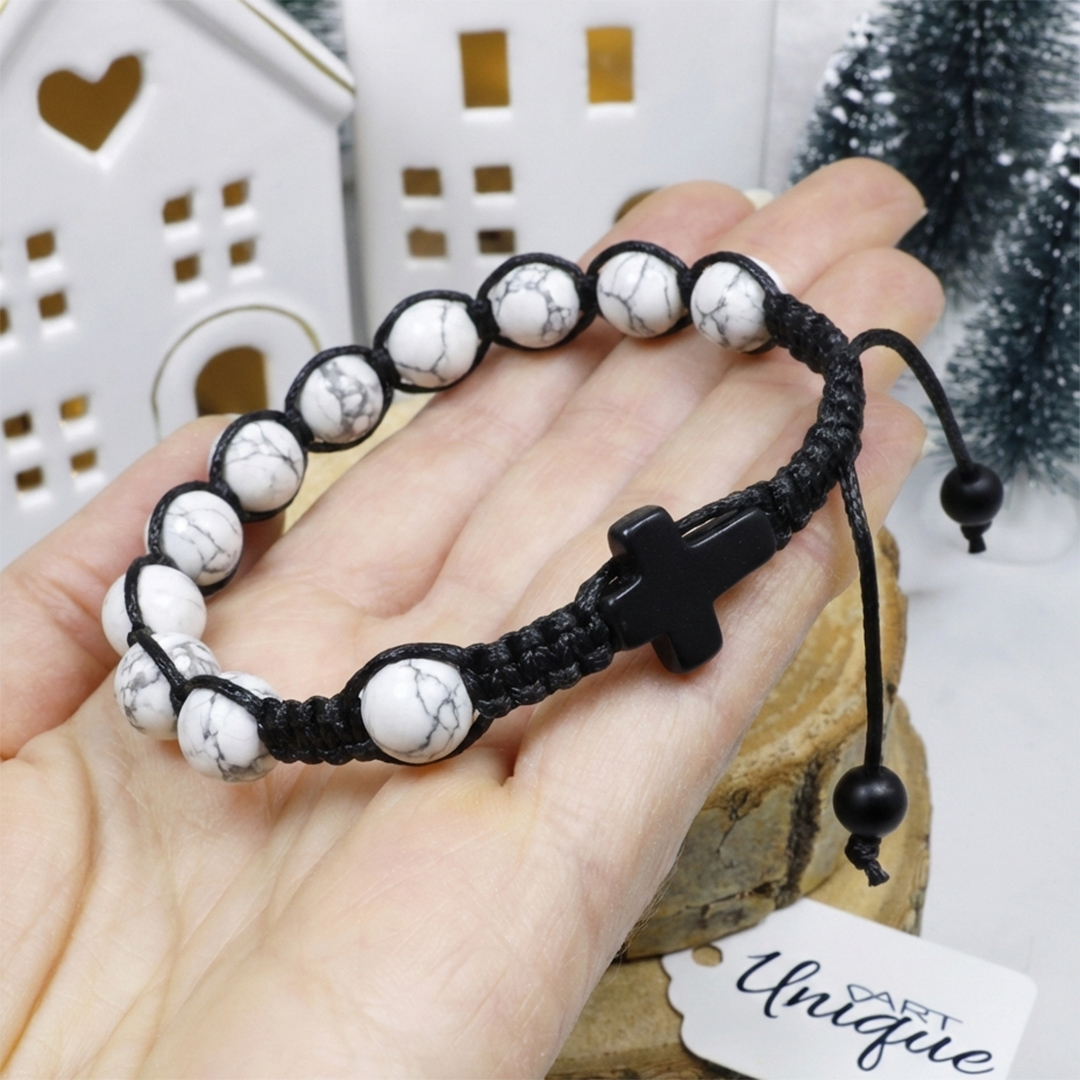 Bransoletka wykonana z naturalnych kamieni ozdobnych - białego howlitu oraz czarnego matowego onyksu metodą plecionki makramowej ze sznurka z wysokiej jakości włókien o podwyższonej odporności na wycieranie oraz wodę.