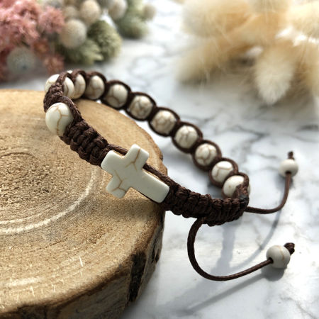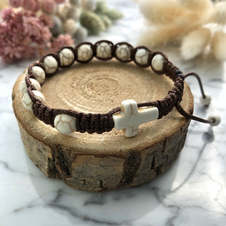 Bransoletka wykonana z kamieni ozdobnych - kremowego howlitu metodą plecionki makramowej ze sznurka z wysokiej jakości włókien o podwyższonej odporności na wycieranie oraz wodę.