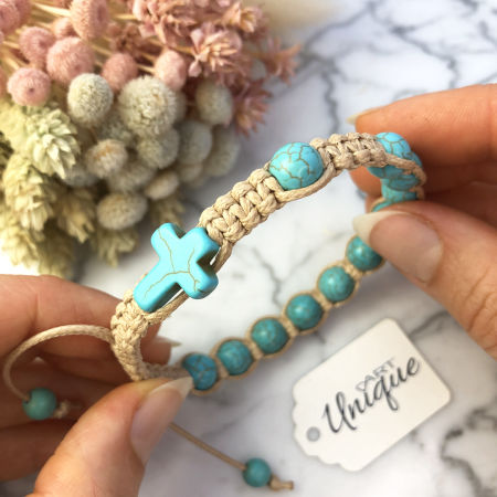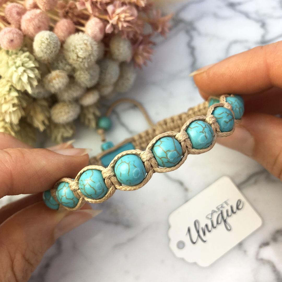 Bransoletka wykonana z kamieni ozdobnych - turkusowego howlitu metodą plecionki makramowej ze sznurka z wysokiej jakości włókien o podwyższonej odporności na wycieranie oraz wodę.
