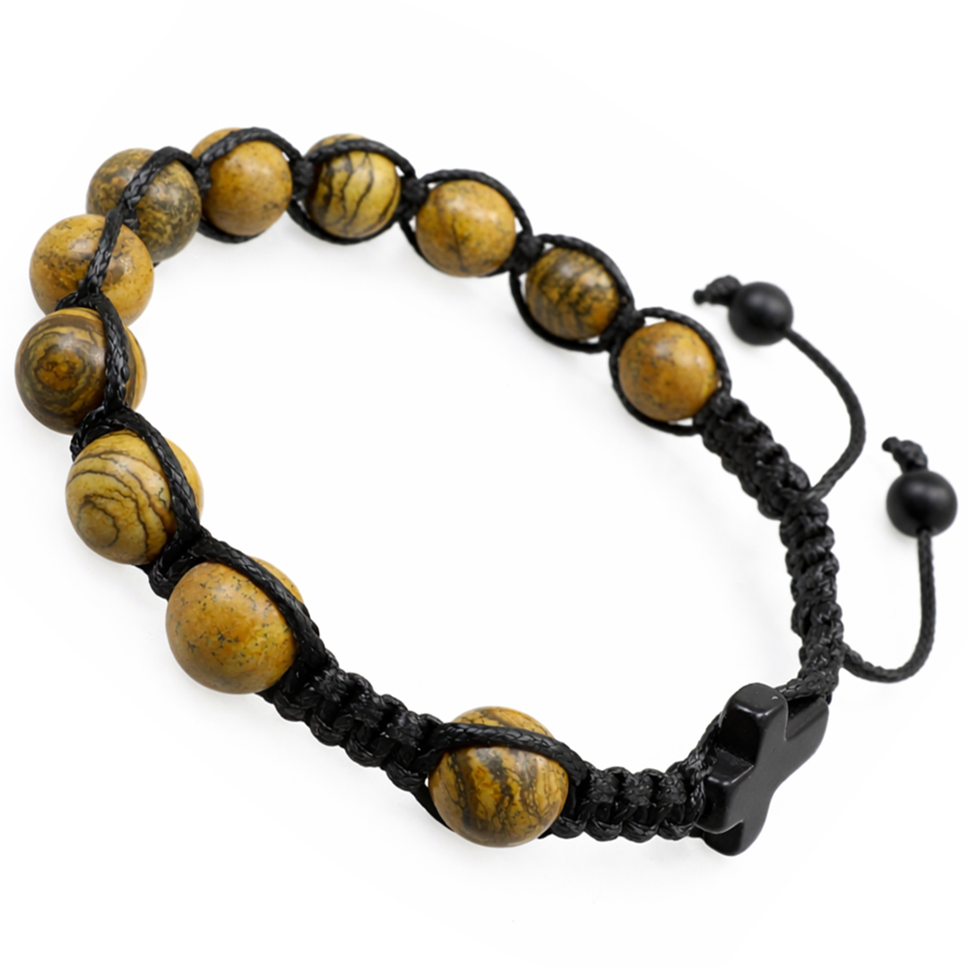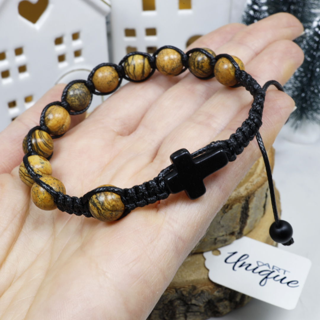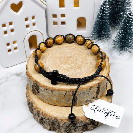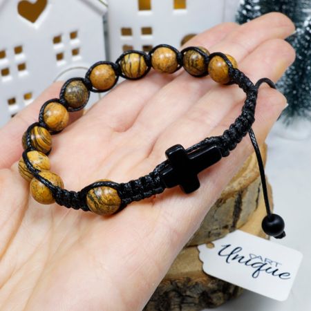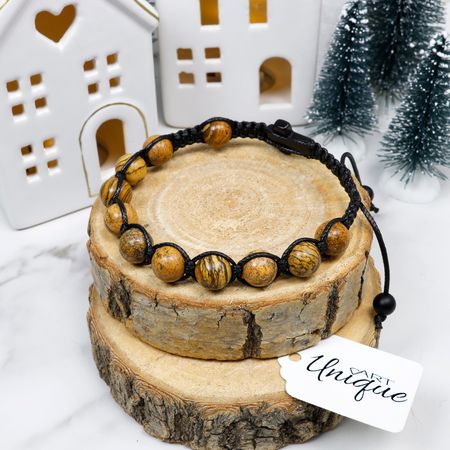 Bransoletka wykonana z naturalnych kamieni ozdobnych - jaspisu krajobrazowego oraz czarnego matowego onyksu metodą plecionki makramowej ze sznurka z wysokiej jakości włókien o podwyższonej odporności na wycieranie oraz wodę.