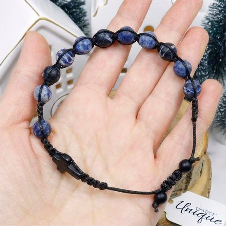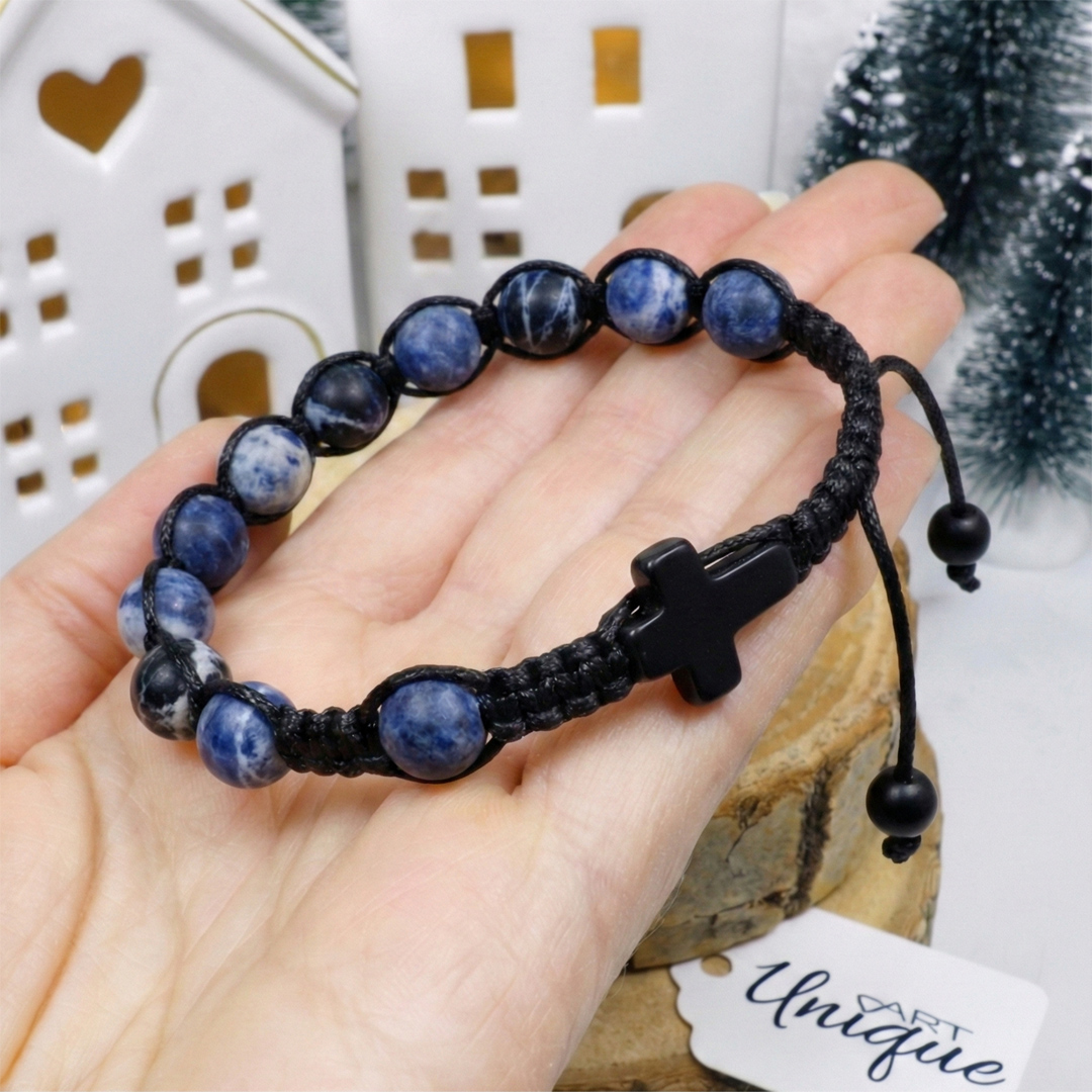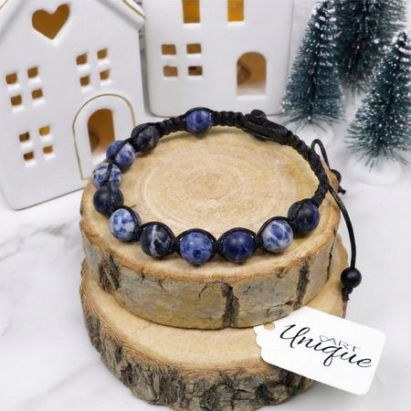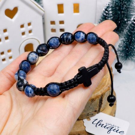 Bransoletka wykonana z naturalnych kamieni ozdobnych - sodalitu matowego oraz czarnego matowego onyksu metodą plecionki makramowej ze sznurka z wysokiej jakości włókien o podwyższonej odporności na wycieranie oraz wodę.