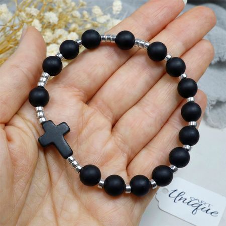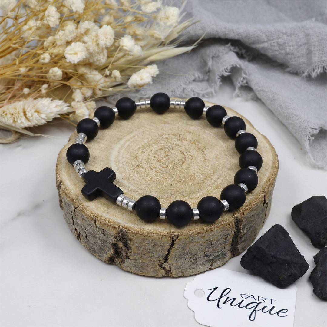 Różaniec wykonany z naturalnych kamieni półszlachetnych – onyksu matowego i hematytu – na trwałej gumce jubilerskiej.