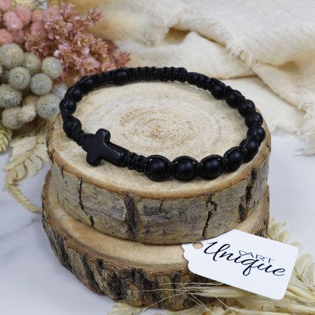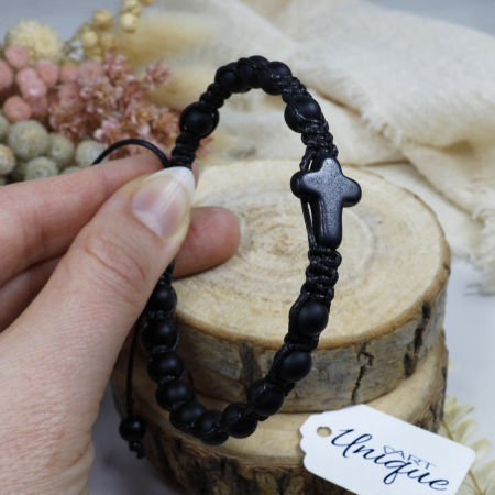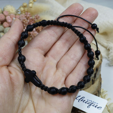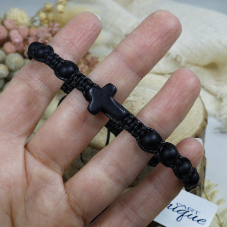 Bransoletka wykonana z naturalnych kamieni ozdobnych - czarnego matowego onyksu metodą plecionki makramowej ze sznurka z wysokiej jakości włókien o podwyższonej odporności na wycieranie oraz wodę.