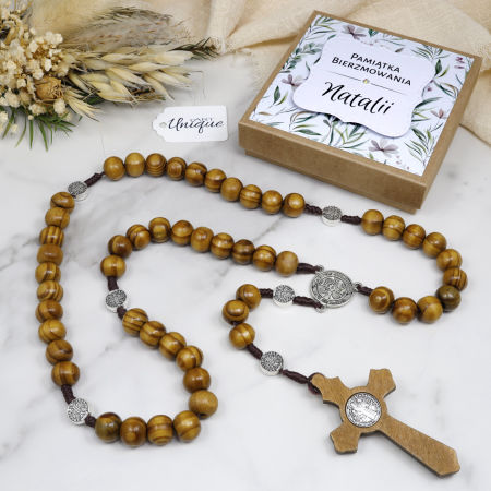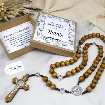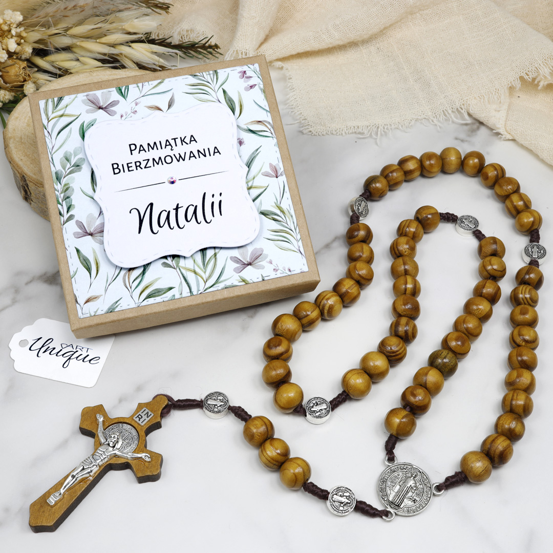 Drewniany różaniec z medalikami Św. Benedykta – Wyjątkowa Pamiątka Bierzmowania lub Komunii