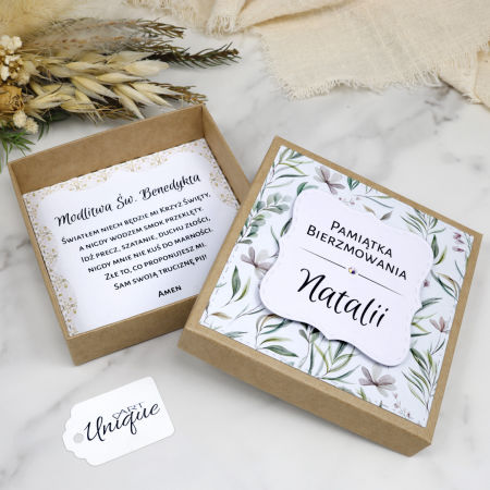 Ręcznie robione pudełeczko, ozdobione napisem „Pamiątka Bierzmowania” + imię osoby bierzmowanej, dodaje osobistego charakteru i sprawia, że prezent staje się unikalny. Na życzenie możliwa jest zmiana napisu na „Pamiątka I Komunii Świętej” + imię. Inne napisy nie są dostępne.