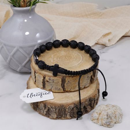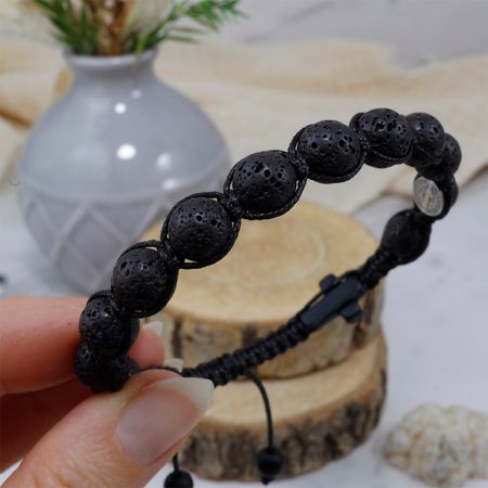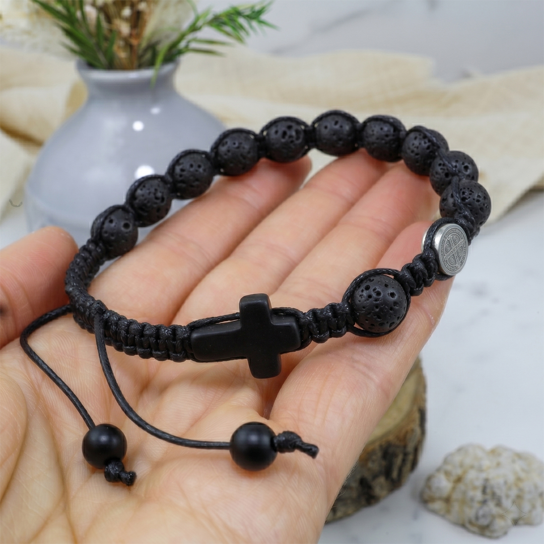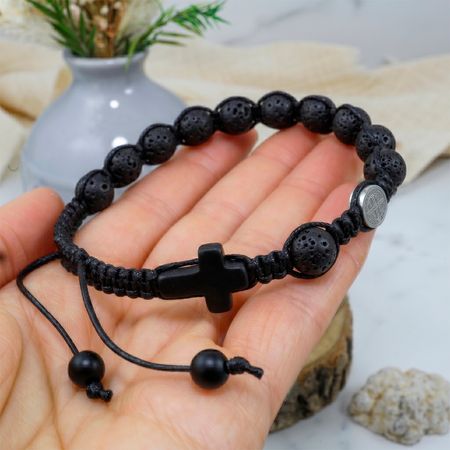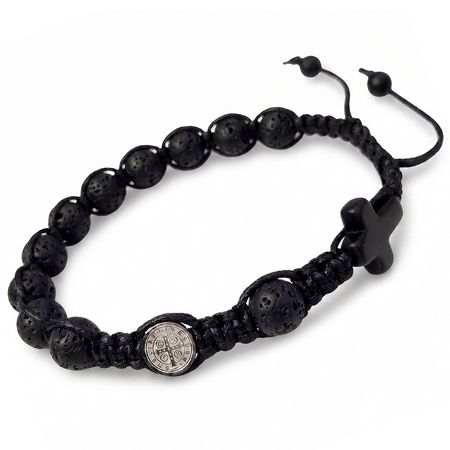 Bransoletka z naturalnych kamieni ozdobnych - lawy wulkanicznej, czarnego matowego onyksu z medalionem Św. Benedykta ze stali nierdzewnej (chirurgicznej).