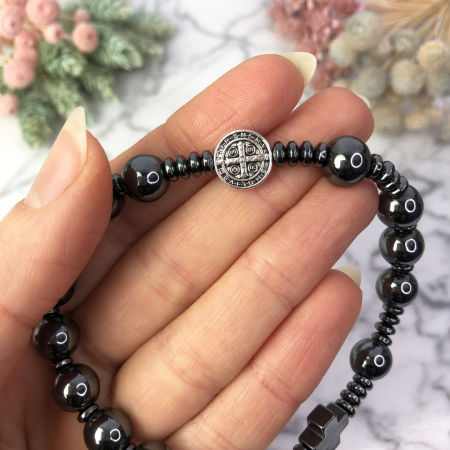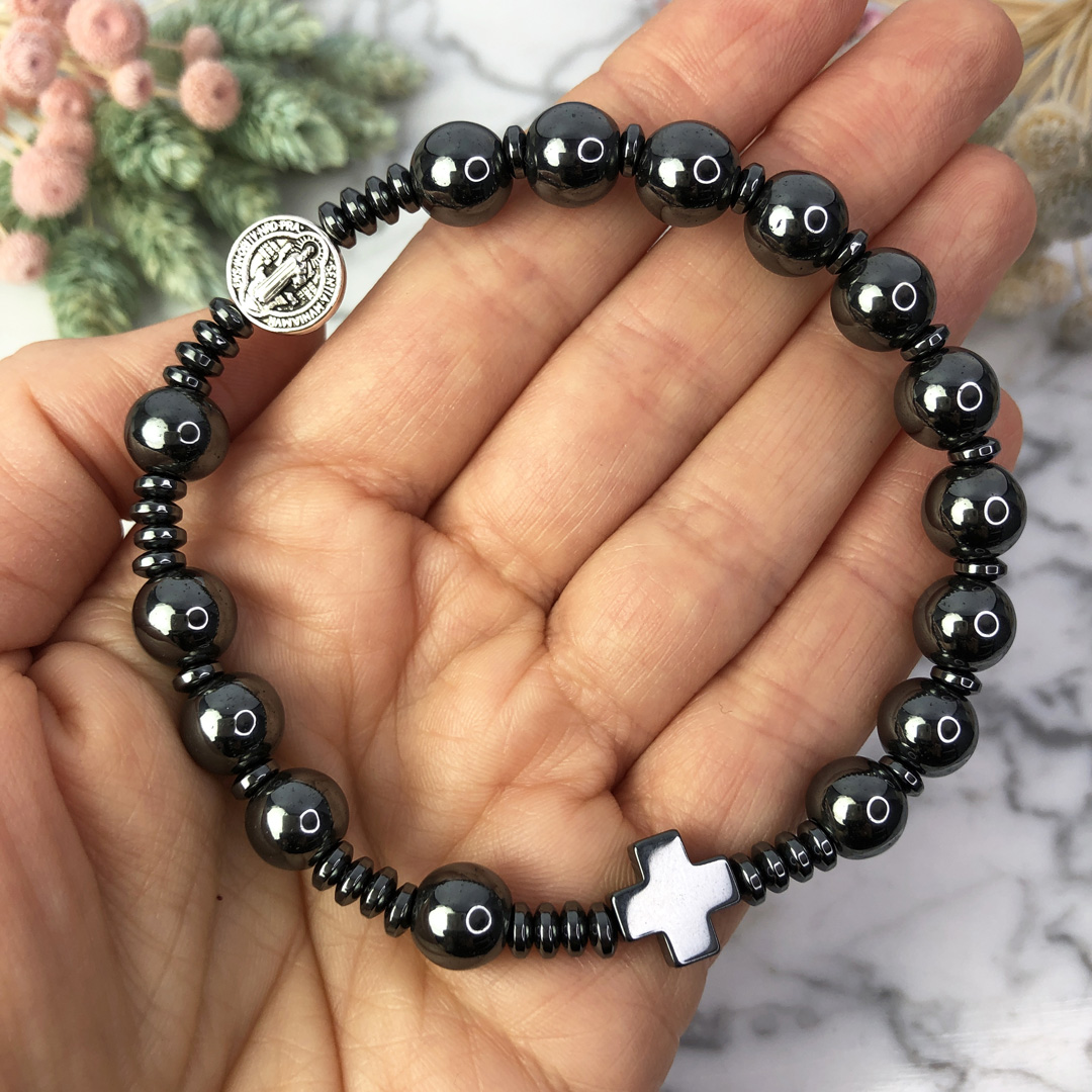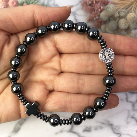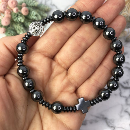 Bransoletka wykonana z kamieni ozdobnych - hematytu z medalionem Św. Benedykta na mocnej, podwójnej gumce silikonowej.