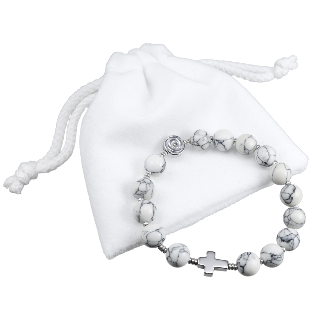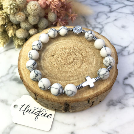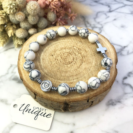 Bransoletka wykonana w całości z kamieni ozdobnych - białego howlitu i hematytu w kolorze srebrnym na mocnej silikonowej gumce jubilerskiej.