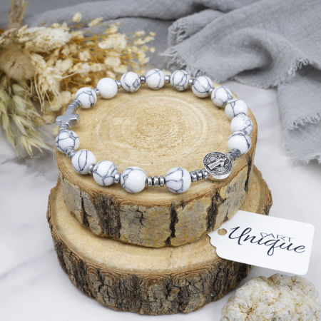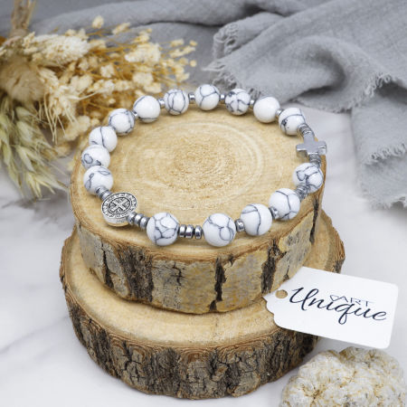 Bransoletka wykonana z kamieni ozdobnych - białego howlitu i srebrnego hematytu z medalionem Św. Benedykta na mocnej, silikonowej gumce jubilerskiej.