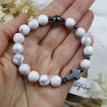 Bransoletka wykonana z kamieni ozdobnych - białego howlitu i czarnego hematytu na mocnej, silikonowej gumce jubilerskiej.