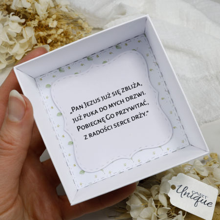 Zapakowana w unikalne, ręcznie robione i spersonalizowane ozdobne pudełeczko podarunkowe – idealna jako prezent.