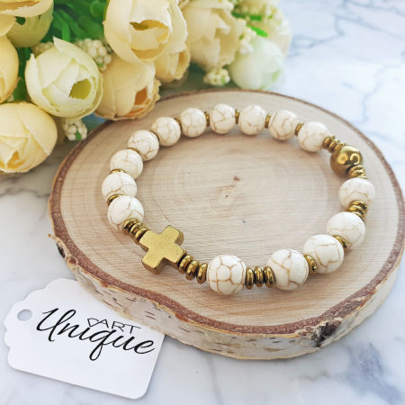 Różaniec wykonany z naturalnych kamieni półszlachetnych - kremowego howlitu i hematytu na mocnej, podwójnej gumce silikonowej.