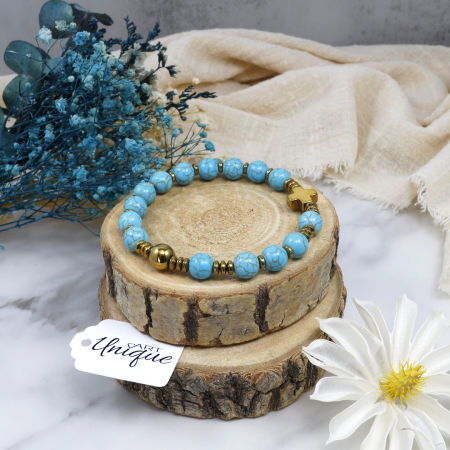 Rodzaj i kolor kamieni: turkusowy howlit z brązowymi żyłkami oraz złoty hematyt