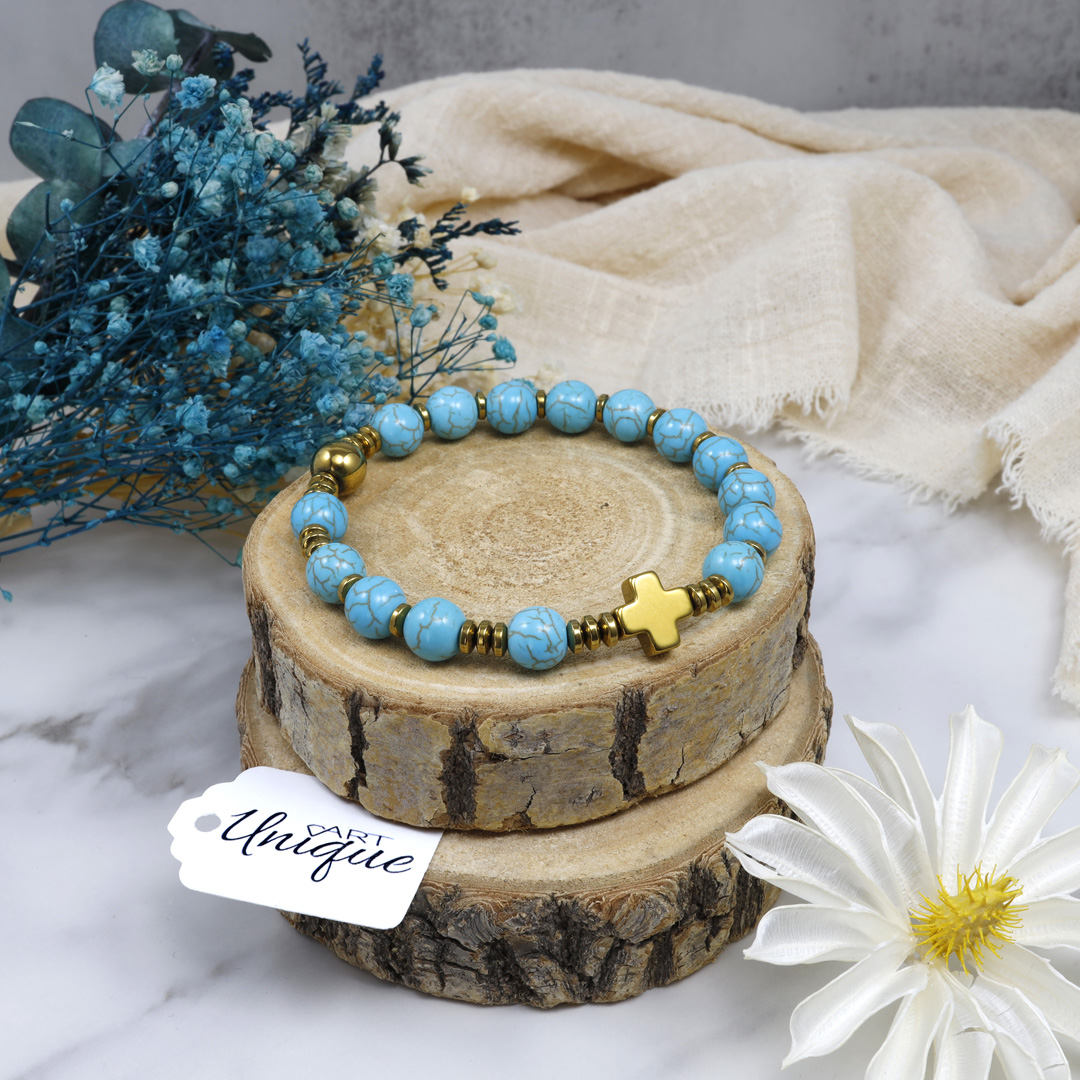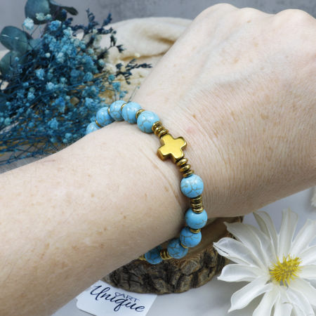 Różaniec wykonany z naturalnych kamieni półszlachetnych - turkusowego howlitu i hematytu na mocnej, podwójnej gumce silikonowej.