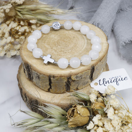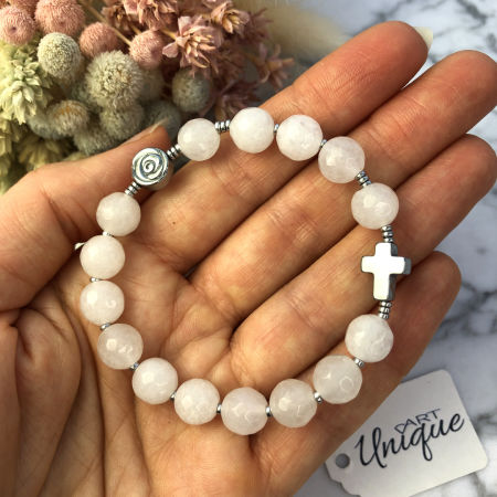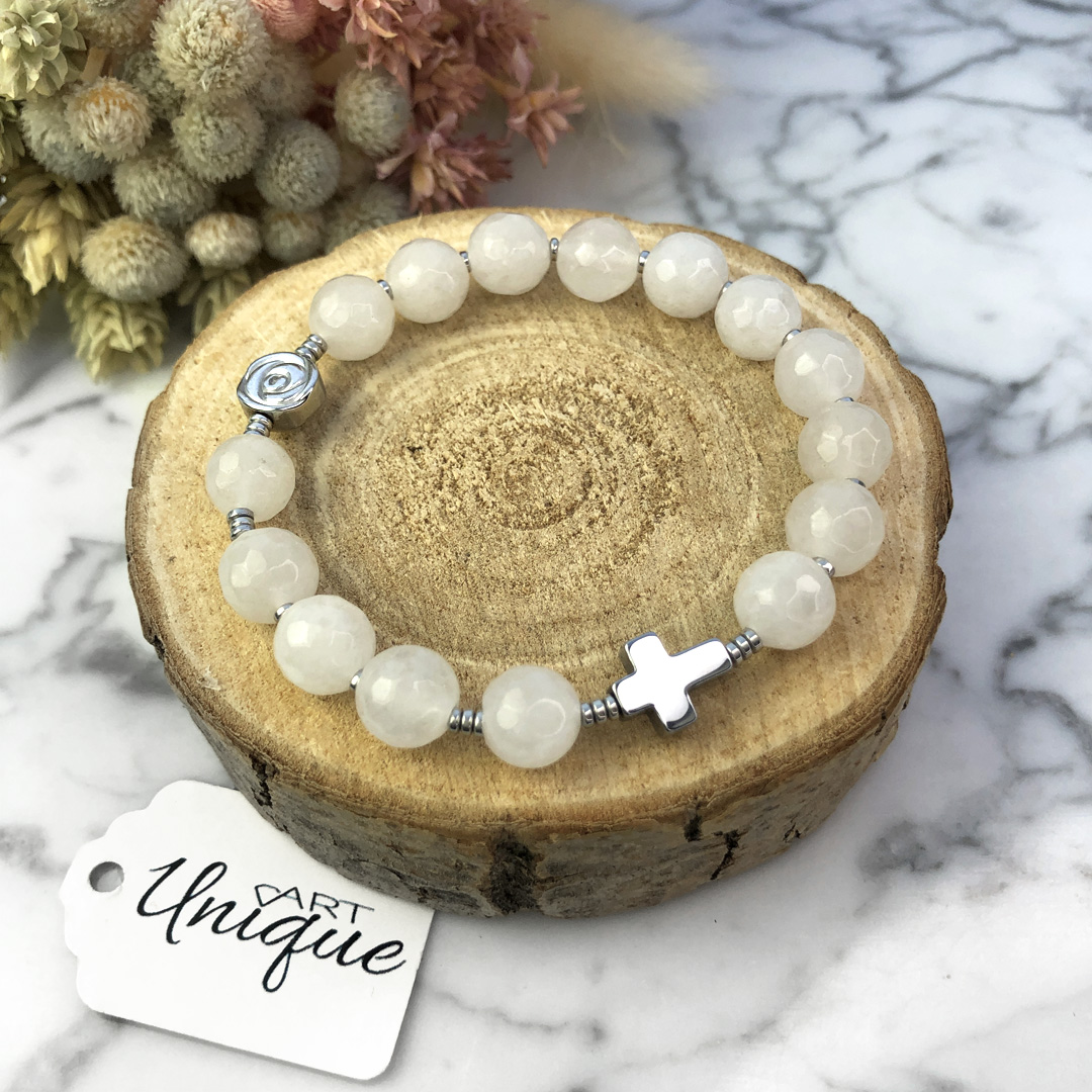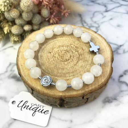 Bransoletka wykonana w całości z kamieni ozdobnych - białego jadeitu i hematytu w kolorze srebrnym na mocnej silikonowej gumce jubilerskiej.