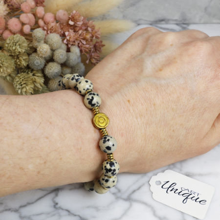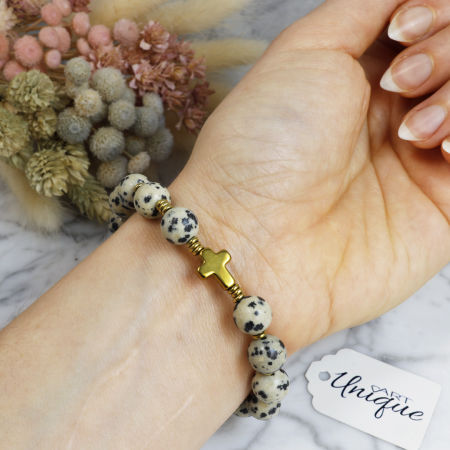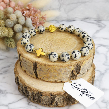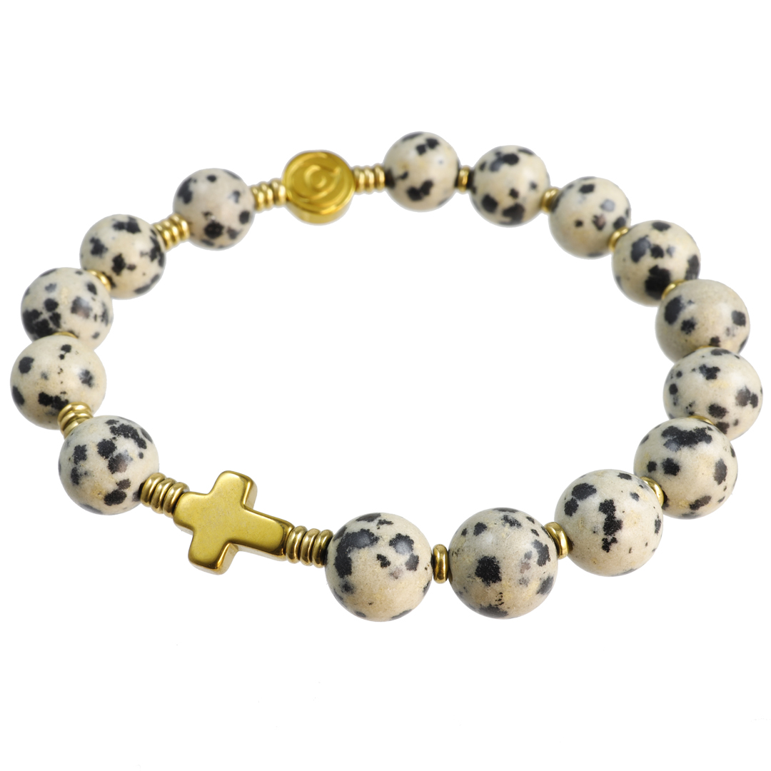 Różaniec wykonany w całości z naturalnych, ozdobnych kamieni półszlachetnych - jaspisu dalmatyńskiego i złotego hematytu na mocnej, silikonowej gumce jubilerskiej.