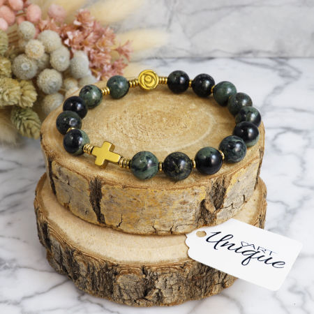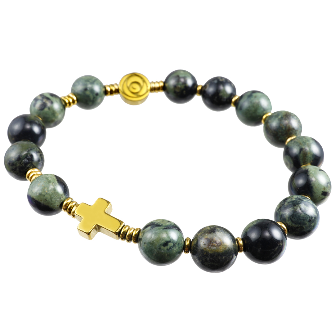 Różaniec wykonany w całości z naturalnych, ozdobnych kamieni półszlachetnych - jaspisu Kambaba i złotego hematytu na mocnej, silikonowej gumce jubilerskiej.