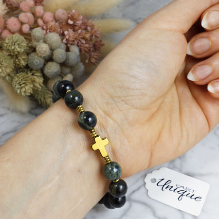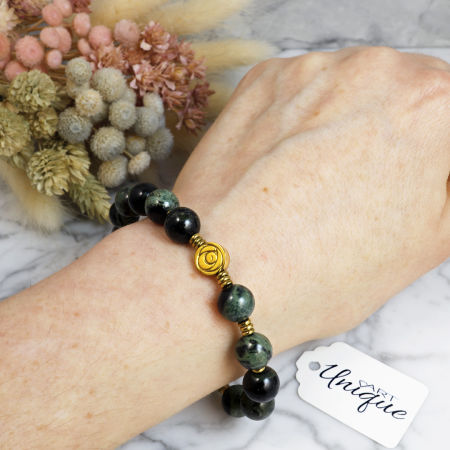Rodzaj i kolor kamieni: jaspis kambaba w odcieniach zieleni i czerni oraz złoty hematyt