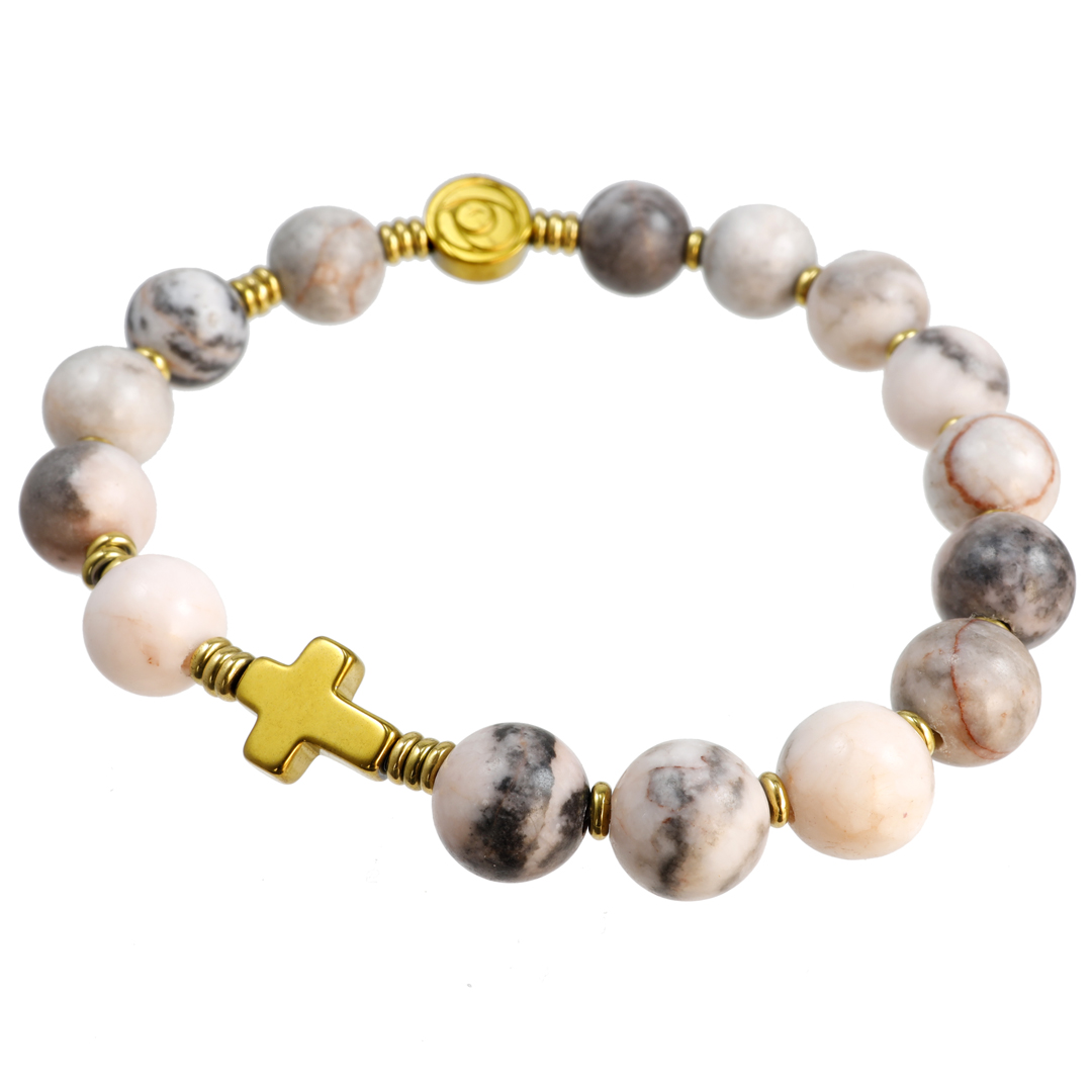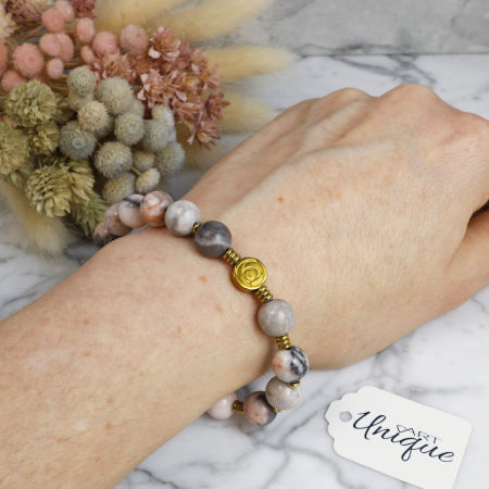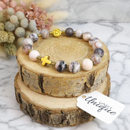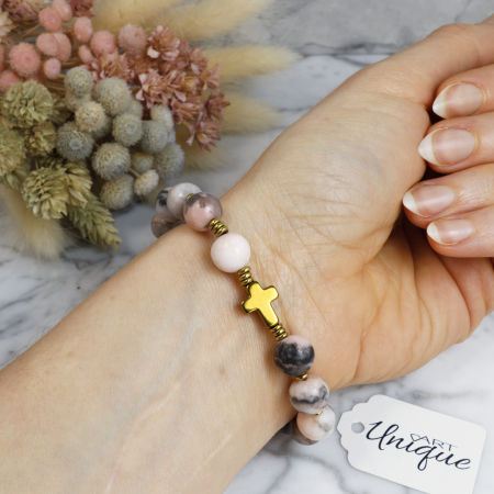 Różaniec wykonany w całości z naturalnych, ozdobnych kamieni półszlachetnych - jaspisu "Pink Zebra" i złotego hematytu na mocnej, silikonowej gumce jubilerskiej.