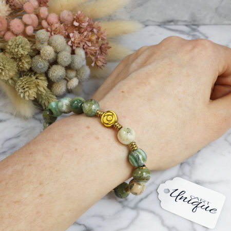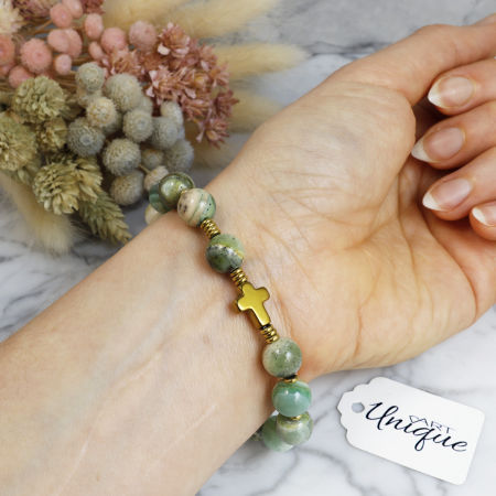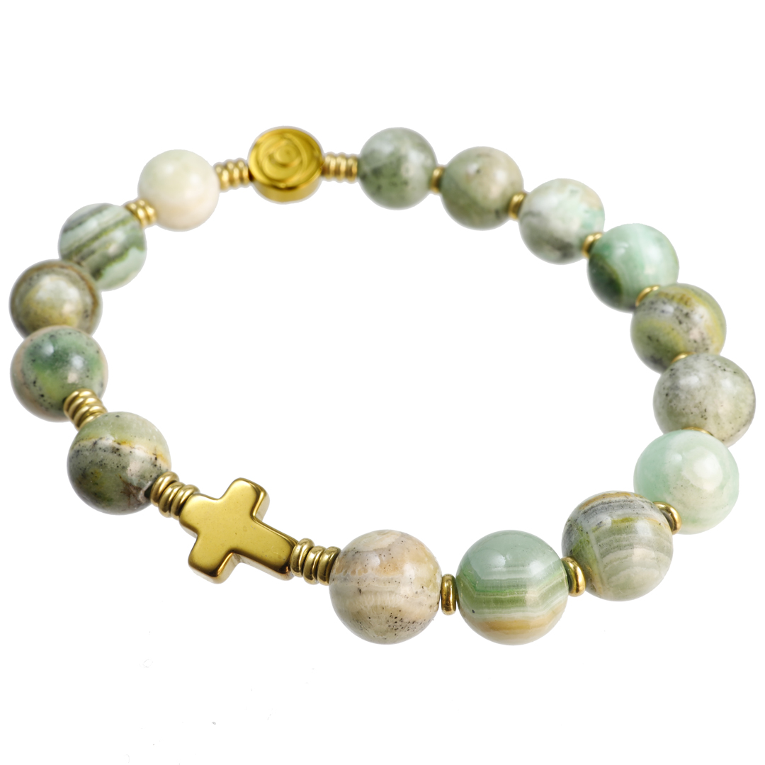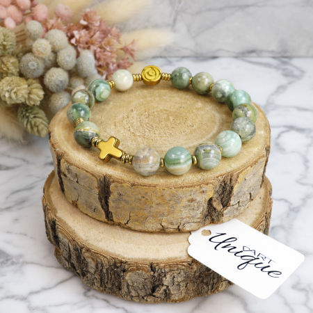 Różaniec wykonany w całości z naturalnych, ozdobnych kamieni półszlachetnych - kalcytu zielonego i złotego hematytu na mocnej, silikonowej gumce jubilerskiej.
