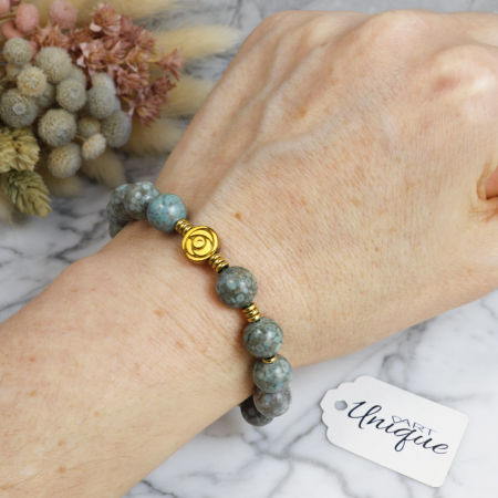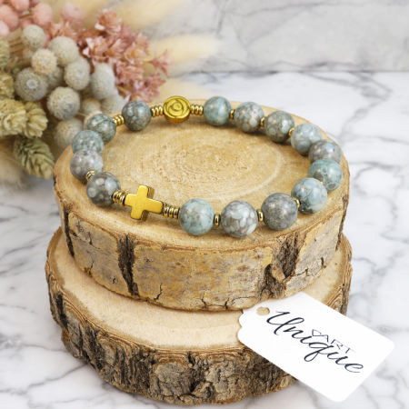 Różaniec wykonany w całości z naturalnych, ozdobnych kamieni półszlachetnych - kamienia mafanowego i złotego hematytu na mocnej, silikonowej gumce jubilerskiej.