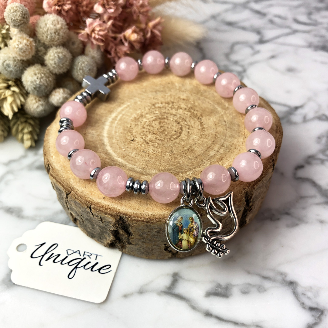 Różaniec wykonany z naturalnych kamieni półszlachetnych - kwarcu różowego i hematytu na mocnej, podwójnej gumce silikonowej.