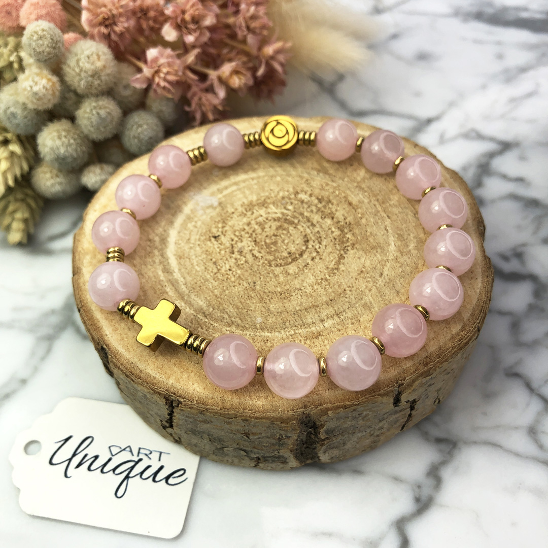 Różaniec wykonany w całości z naturalnych, ozdobnych kamieni półszlachetnych - kwarcu różowego i złotego hematytu na mocnej, silikonowej gumce jubilerskiej.