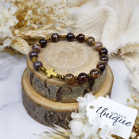 ➤ Rodzaj i kolor kamieni: agat w odcieniach brązu i beżu oraz złoty hematyt.