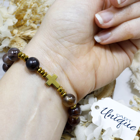 Różaniec wykonany z naturalnych kamieni półszlachetnych – agatu brązowego i hematytu – na trwałej gumce jubilerskiej.