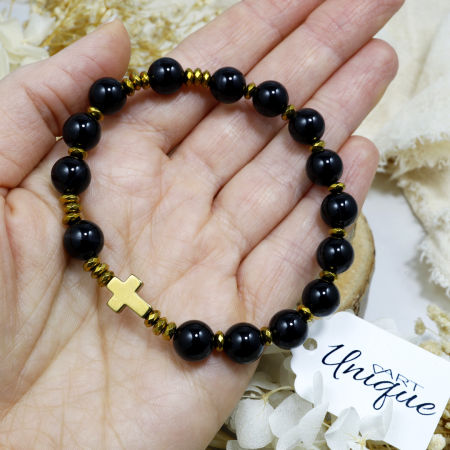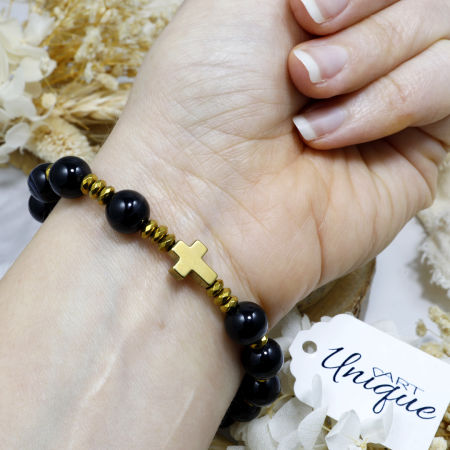 Różaniec wykonany z naturalnych kamieni półszlachetnych – agatu czarnego i hematytu – na trwałej gumce jubilerskiej.