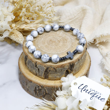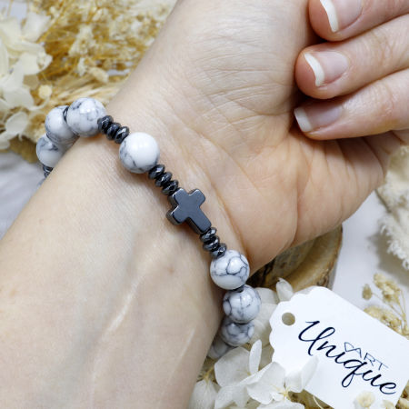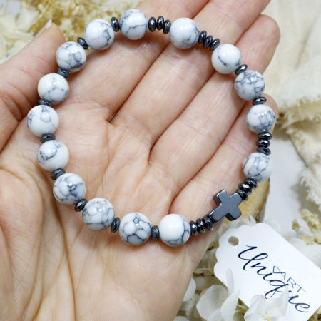 Różaniec wykonany z naturalnych kamieni półszlachetnych – białego howlitu i czarnego hematytu – na trwałej gumce jubilerskiej.