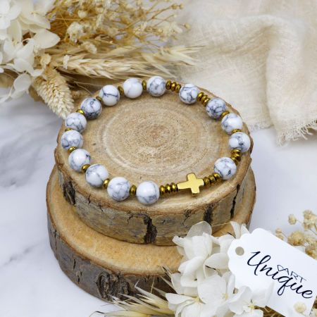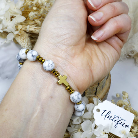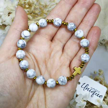 Różaniec wykonany z naturalnych kamieni półszlachetnych – białego howlitu i złotego hematytu – na trwałej gumce jubilerskiej.