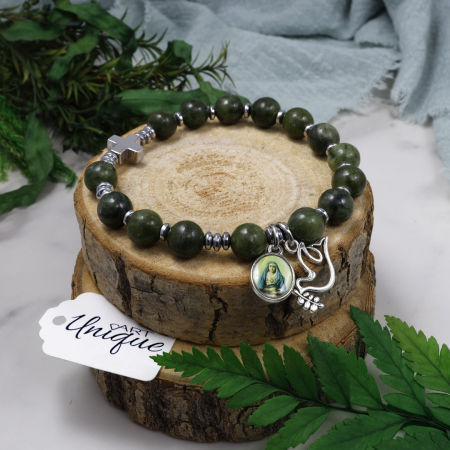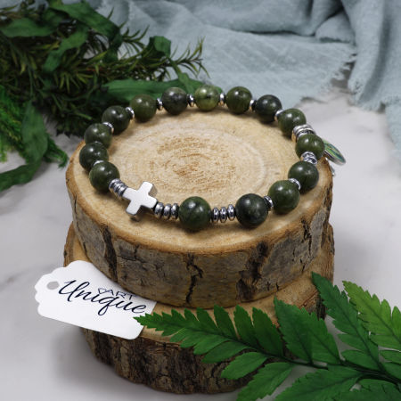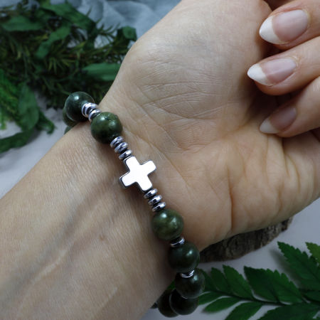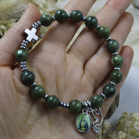 Różaniec wykonany z kamieni ozdobnych - jadeitu zielonego i hematytu na mocnej, silikonowej gumce jubilerskiej.