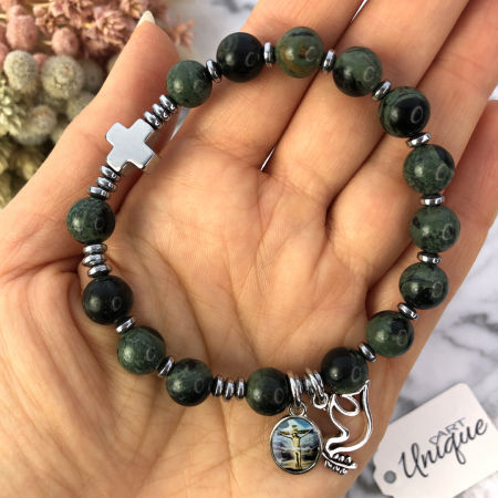 Różaniec wykonany z naturalnych kamieni półszlachetnych - jaspisu Kambaba i hematytu na mocnej, podwójnej gumce silikonowej.