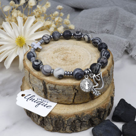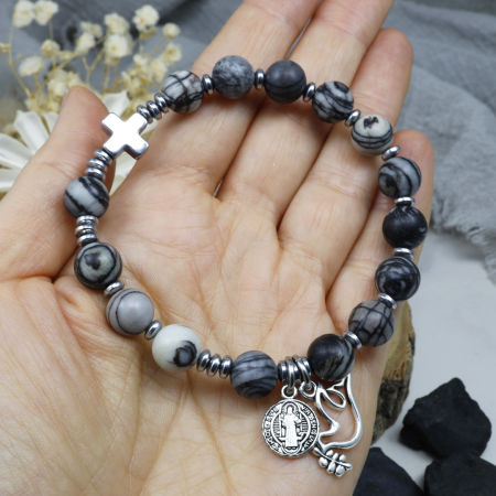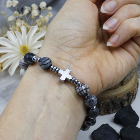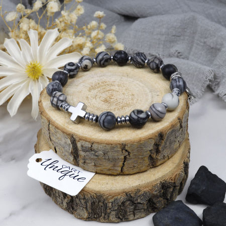 Różaniec wykonany z naturalnych kamieni półszlachetnych - jaspisu "Spider Web" i hematytu na mocnej, silikonowej gumce jubilerskiej.