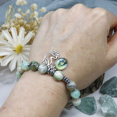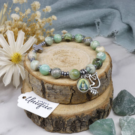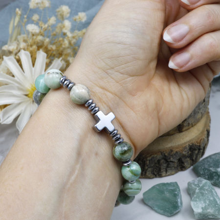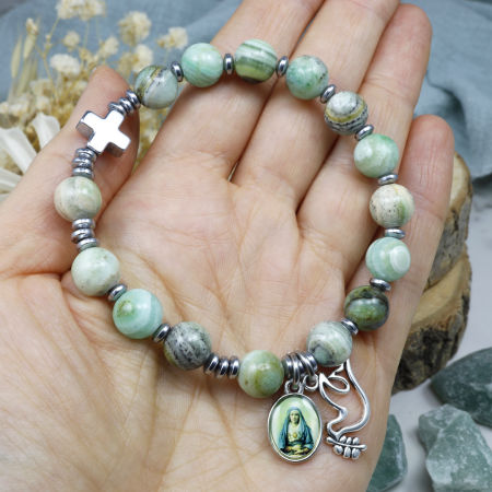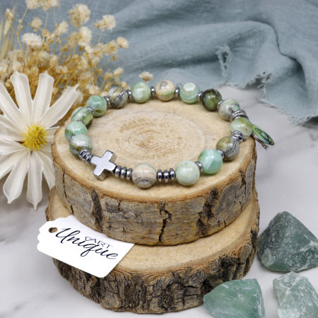 Różaniec wykonany z kamieni ozdobnych - kalcytu zielonego i hematytu na mocnej, silikonowej gumce jubilerskiej.
