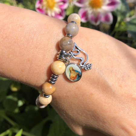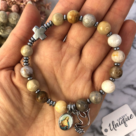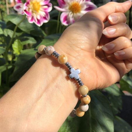 Różaniec wykonany z naturalnych kamieni półszlachetnych - kamienia chryzantemowego i hematytu na mocnej, podwójnej gumce silikonowej.