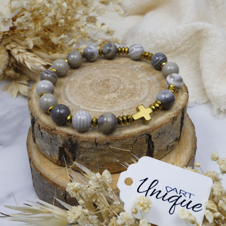 ➤ Rodzaj i kolor kamieni: krzemień pasiasty w odcieniach brązu, szarości i beżu oraz złoty hematyt.