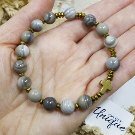 Różaniec wykonany z naturalnych kamieni półszlachetnych – krzemienia pasiastego i hematytu – na trwałej gumce jubilerskiej.