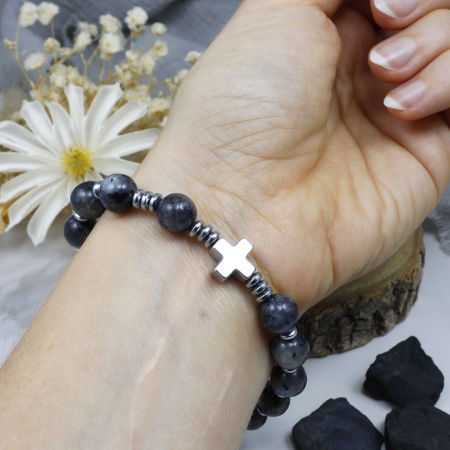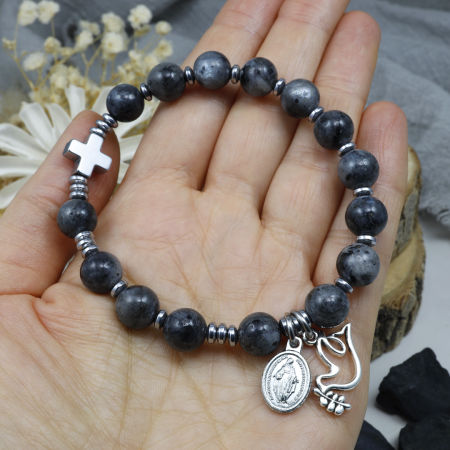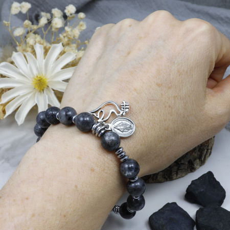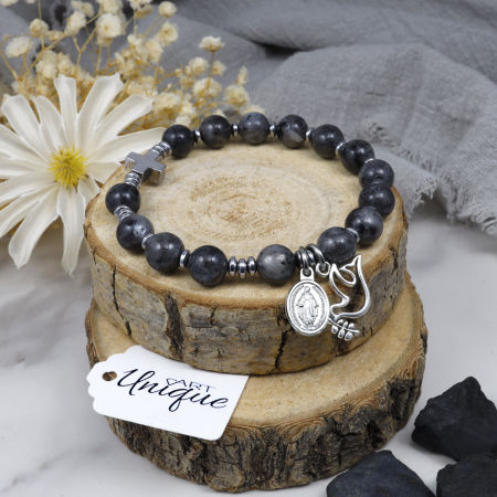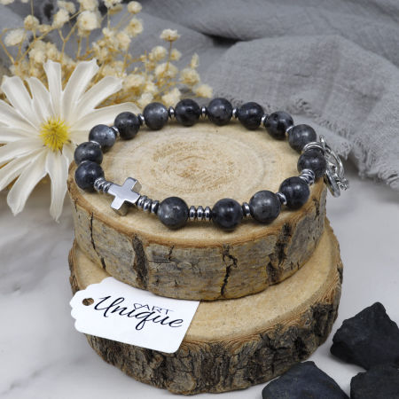 Różaniec wykonany z naturalnych kamieni półszlachetnych - larvikitu (inaczej labradorytu norweskiego) i hematytu na mocnej, silikonowej gumce jubilerskiej.