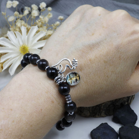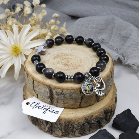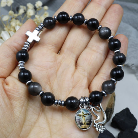 Różaniec wykonany z naturalnych kamieni półszlachetnych - obsydiany srebrnego i hematytu na mocnej, silikonowej gumce jubilerskiej.