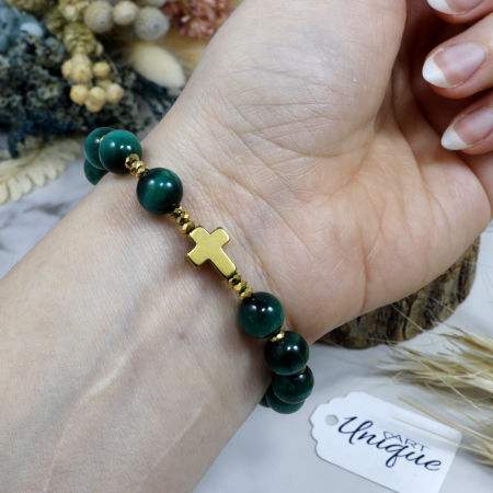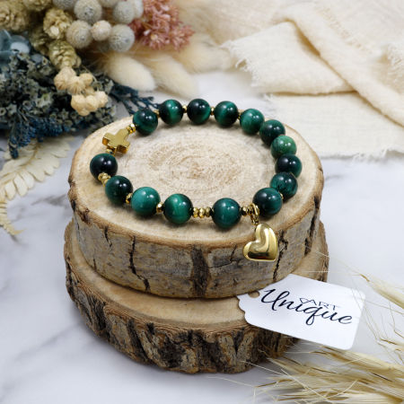 Rodzaj i kolor kamieni: tygrysie oko w odcieniach malachitowej zieleni oraz złoty hematyt