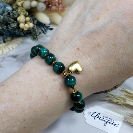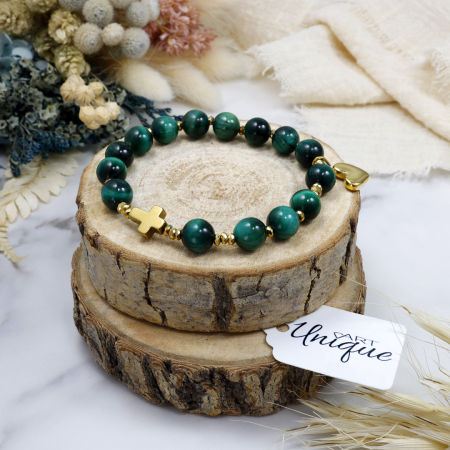 Różaniec wykonany z naturalnych kamieni półszlachetnych - tygrysiego oka i hematytu na mocnej silikonowej gumce jubilerskiej. Całość dopełnia elegancka przywieszka w kształcie serduszka, wykonana ze stali nierdzewnej w kolorze złotym.