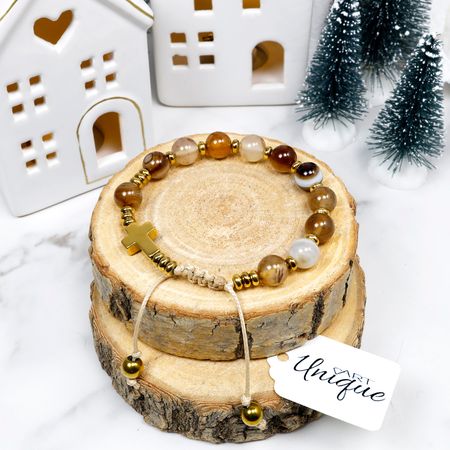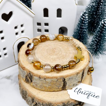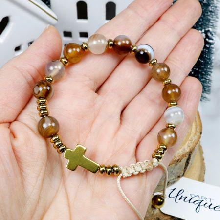 ➤ Rodzaj i kolor kamieni: agat w odcieniach brązu i beżu oraz złoty hematyt.
