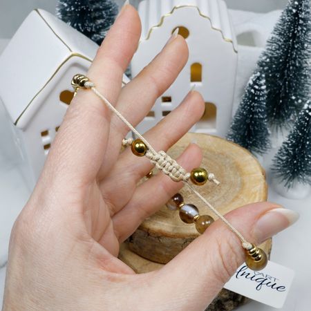 Obwód regulowany jest za pomocą węzła makramowego, co ułatwia zakładanie i zdejmowanie bransoletki oraz pozwala na wygodne dopasowanie do nadgarstka.