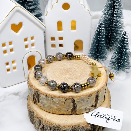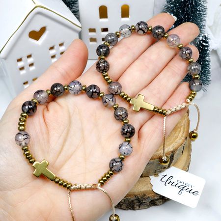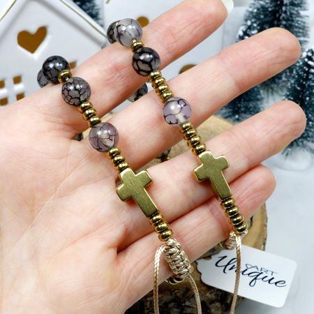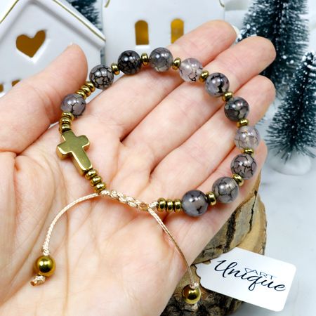 Różaniec w formie bransoletki, wykonany z naturalnych kamieni półszlachetnych – agatu smoczego szarego i hematytu – nawleczonych na wodoodporny sznurek.