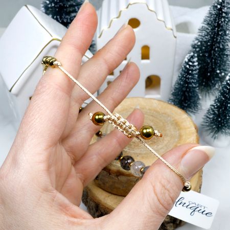 Obwód regulowany jest za pomocą węzła makramowego, co ułatwia zakładanie i zdejmowanie bransoletki oraz pozwala na wygodne dopasowanie do nadgarstka.