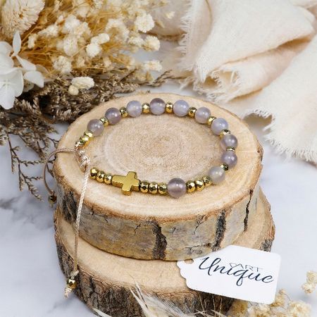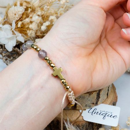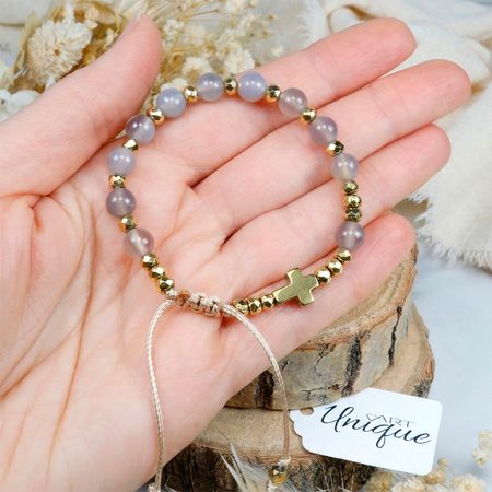 Różaniec w formie bransoletki, wykonany z naturalnych kamieni półszlachetnych – agatu szarego i hematytu – nawleczonych na wodoodporny sznurek.
