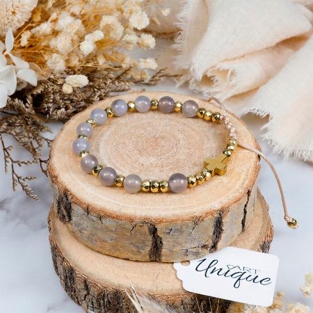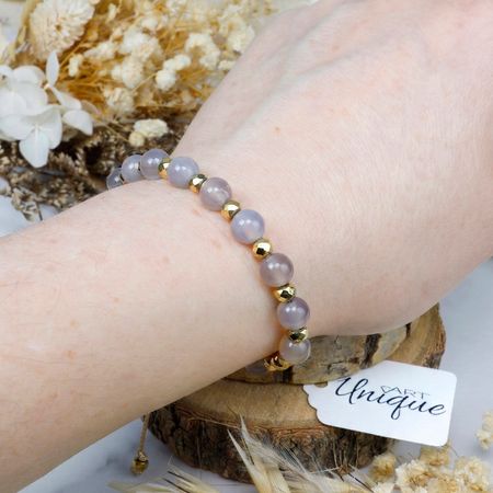 ➤ Rodzaj i kolor kamieni: agat w odcieniach szarości i beżu oraz złoty hematyt