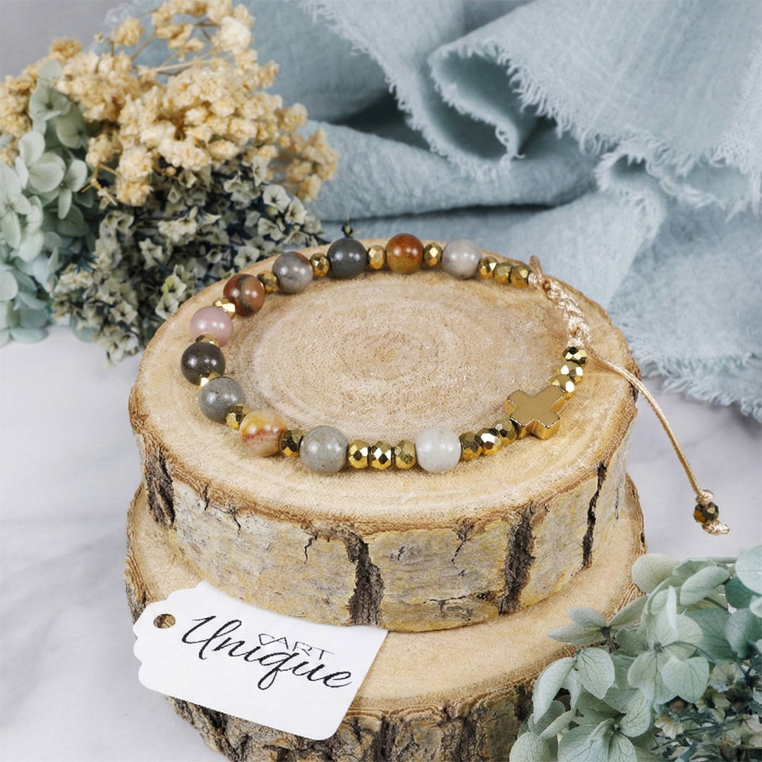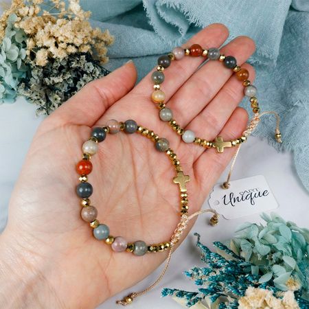 ➤ Rodzaj i kolor kamieni: wielokolorowy agat oraz złoty hematyt.
